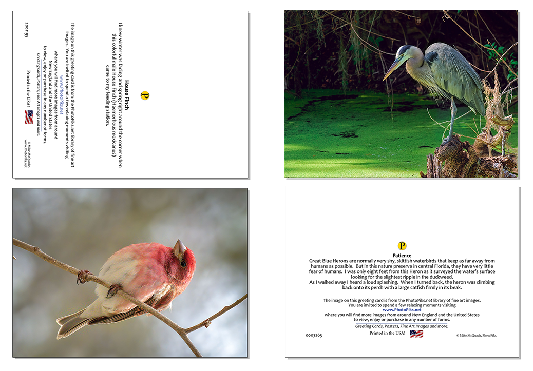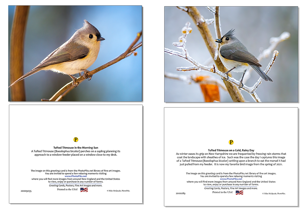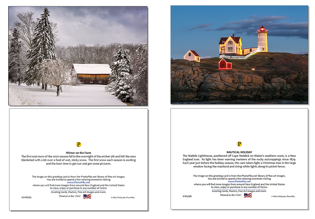 Press Printed UV coated photographic note cards with mailing envelopes available in the Lakes Region Art Gallery and online. The inside writing surface is a matte stock while the outside has a gloss coating that is post-printing coated with an ultra-violet coating. This UV coating adds vibrance to the colors and protects the image against fading and scuffing.