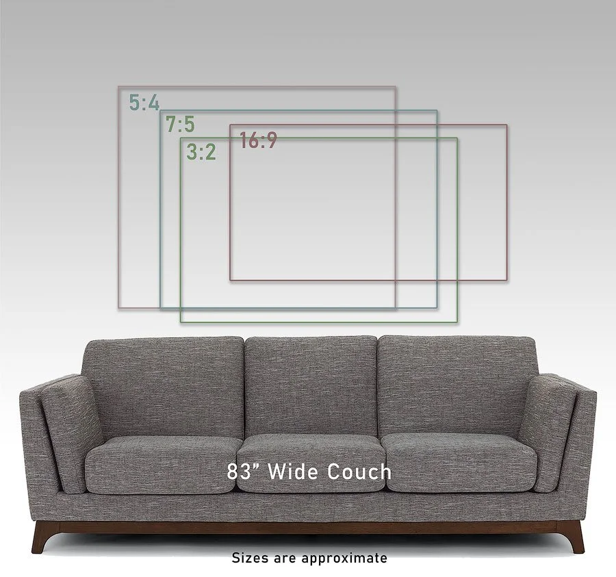 Each rectangle in the diagram below is based on a 48” wide image. The width remains constant for each rectagle with only the height changing. The digits in the upper left corner of each image is the crop factor, listed as a ratio. Using this diagram you will be able to visualize how your image would “fit” your available wall space in each crop factor.