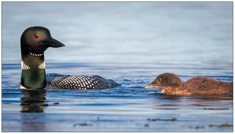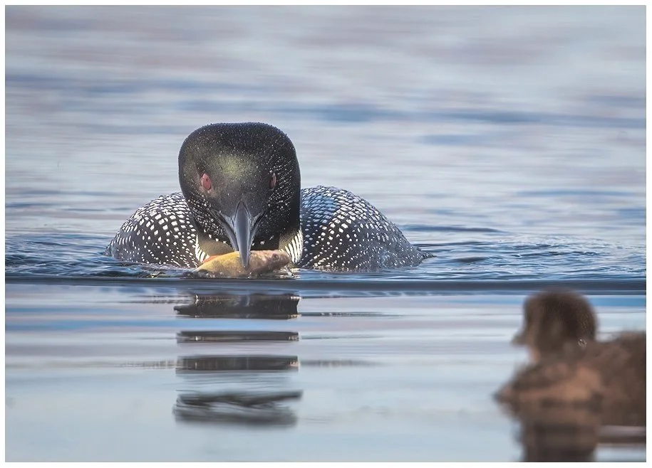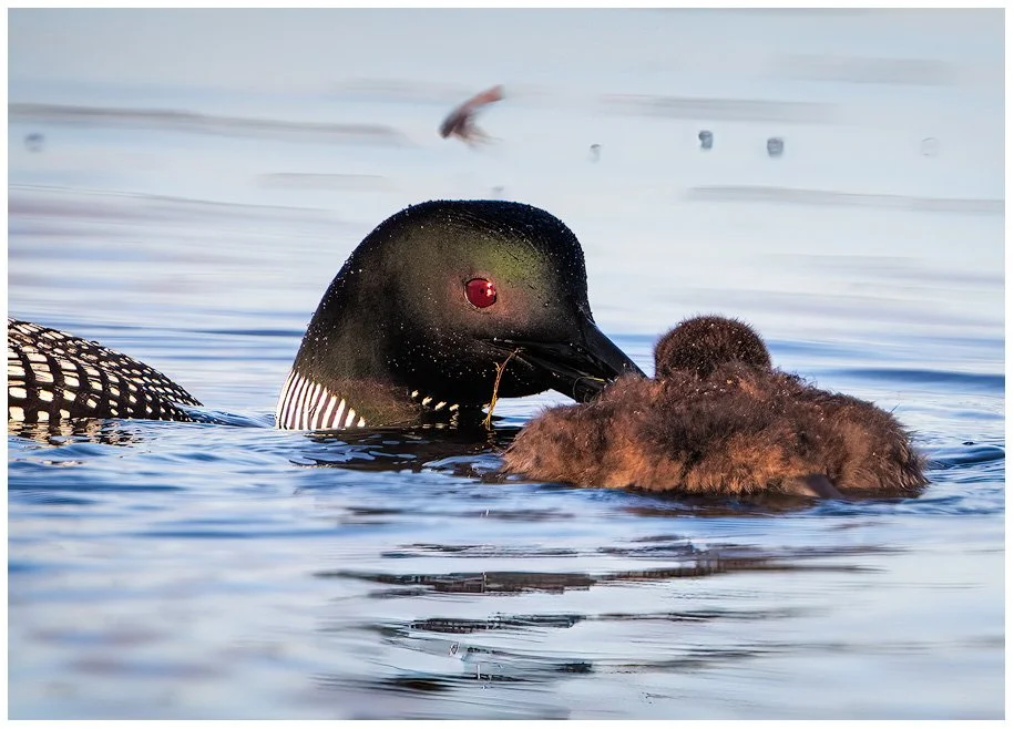 Everyone makes mistakes and loons are no exception. In this series of images, you see mama loon with a small perch in her beak, swimming towards her chick that is swimming toward her, presumably grateful for breakfast. As mama loon gets closer, she dips her head in the water to reposition the perch to better feed her offspring. When she raises her head back out of the water you notice the perch is missing. Then you see her tilt her head to look down for the fish and in subsequent images, you see her look at the youngster who has now lowered it’s head is disappointment.
