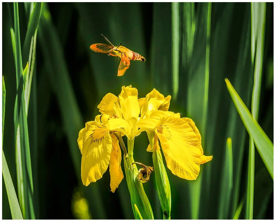 I was lucky to capture this Hummingbird Clearwing moth making its final approach to a yellow swamp iris. Each late spring this roadside wetland explodes with hundreds of yellow iris. This year I noticed a few, smaller wild blue iris in the swamps as well.